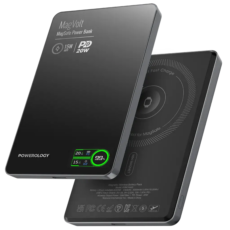 The Powerology MagVolt 5000mAh Power Bank is a stylish and effective charging option that keeps your gadgets charged while you're on the run. It adds a contemporary element to your everyday charging routine with its very thin design and intelligent LED display. This power bank works with many devices. It has several output options: USB-C, wireless (Qi2), and a special watch output. With a 5000 mAh capacity, it charges quickly and reliably. It offers up to 15W for wireless devices and 20W for USB-C output. This makes it perfect for quick power-ups. Made of a sturdy, lightweight aluminum alloy, it protects against deterioration. Additionally, compatible with MagSafe, the Powerology MagVolt offers smooth magnetic charging. Its small size is great for travel. Plus, it works well in many temperatures, ensuring reliable performance in different settings. The Powerology MagVolt 5000mAh Power Bank is your go-to portable power source for all your needs.